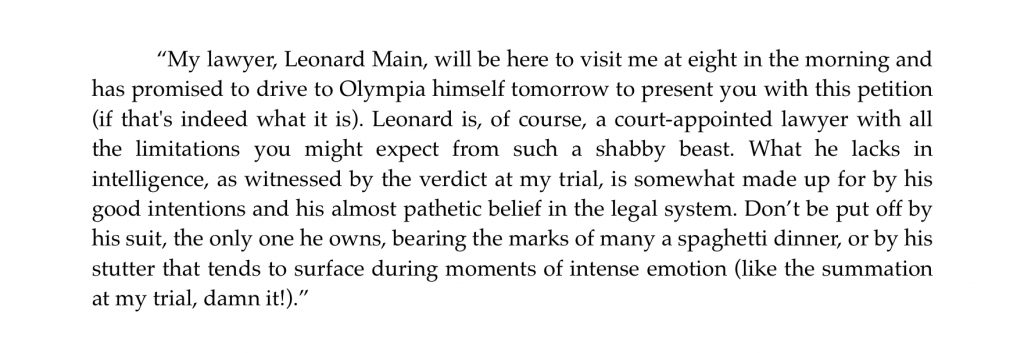 Obviously, I admit my crime. As Jack Ruby discovered, the presence of television cameras at a murder significantly reduces the amount of ambiguity that defense attorneys can throw around during legal proceedings to befuddle the jurors. The crime took place before the bulging eyes of the wealthiest and most influential citizens of Washington State. They became material witnesses and that made my trial as illustrious a social event as the charity ball at which the assassination occurred. Notice that I used the word “assassination.” Remember that, because it will give you some insight into my justification for bringing about such a horrendous event. I did not take a human life without cause and, even though I am willing to submit to justice, I think that my reasons for transgressing the law might warrant the commutation of my sentence to imprisonment until such time as my life is overtaken by natural events, such as the cardiac illnesses and cancers that do in most people.